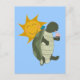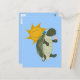 Une tortue jouit d'un cône glacé lors d'une chaude journée dans l'image médiatique mixte sur cette carte postale. La tortue verte se tient debout avec les jambes tendues. Il tient un cône gaufre rempli de crème glacée recouvert d'arroses colorées. Le sourire sur son visage pendant qu'il lèche le gâteau glacé montre sa satisfaction. Un papillon bleu a allumé sa coquille et un soleil souriant brille sur les deux. À partir de mon numériquement d'origine créé image.