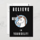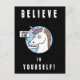 Une licorne de dessin animé avec une expression résolue, "Crois en toi" en lettres et, "Je crois en moi" en ballons de mots. Graphique couleur, t-shirts, sueurs, cartes & cadeaux.