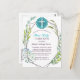 Cette charmante carte postale d'invitation à la première communion présente une belle croix bleu turquoise avec de jolis feuilles botaniques du printemps et des fleurs bleues dans un cadre géométrique sucré. C'est parfait pour inviter des amis et de la famille à la 1ère communion de votre fils ou de votre fille.