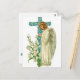 Tableau vintage d'un ange en blanc priant devant une croix de fleurs bleues.