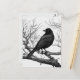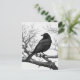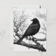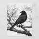 Postcard in a black-and-white illustration featuring a sleek black crow perched on a gnarled, leafless branch. The bird's detailed feathers contrast sharply with the stark, skeletal tree limbs, creating a dramatic composition.