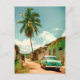 Jolie photo rétro d'une rue sablonneuse du côté de Cuba. Journée d'été avec grand palmier, femme cubaine et voiture plus ancienne américaine.