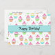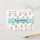 Il s'agit d'une excellente carte postale à envoyer par la poste pour un anniversaire. Il dispose d'un arrière - plan couvert de petits cupcakes. Un graphique d'un ruban bleu traverse le centre avec les mots heureux anniversaire. Le texte à l'avant et à l'arrière sont personnalisables.