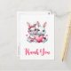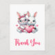 Thank you postcard with an illustration featuring 2 white furry bunnies sharing a big PINK heart. The girl bunny is wearing a cute bow on her head and heart-shaped glasses. The boy bunny is wearing an adorable little suit with a tie.