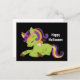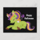 Carte postale avec l'image d'une licorne Frankenstein. Couleurs violettes et vertes. Éffrayant mignon.