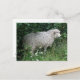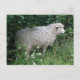Cette jolie carte postale présente une photo d'un mignon mouton moelleux. Le mouton est entouré de fleurs sauvages et d'herbe longue et il mange avidement quelques feuilles. Il a une épaisse couche blanche de laine et un mignon nez noir.