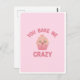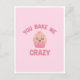 Cute Kawaii Crazy Muffin Cupcake Food Pun Love Citation Postcard avec la mention 'You Bake Me Crazy' est un mignon, excentrique, fou, drôle, punny salut à vos proches. Un muffin de visage idiot fou avec une expression de la langue avec une couleur pastel arrière - plan mettra un sourire de vos valentines, amis, familles, parents, petites amies, petits amis, conjoints, ou amoureux des jeux de nourriture.