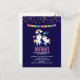 Une invitation à la fête d'anniversaire fantaisiste et féminine. Conçu avec 2 licornes mignonnes avec queues vives et colorées, et crinière. Un arc-en-ciel coloré avec des nuages de chaque côté au-dessus de la tête. D'autres éléments comprennent une petite fleur au coeur et quelques étoiles. Sur le dessus, des points de confettis colorés et vibrants. Juste une image pas un vrai confetti. Une banderole de brassage s'étire sur le dessus. Un arrière - plan violet foncé.