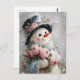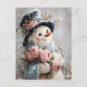 Celebrate the softer side of winter with this romantic snowman design. Dressed in a navy top hat adorned with pink roses and greenery, and holding a matching bouquet, this charming figure adds a whimsical, floral twist to classic holiday decor. Ideal for seasonal prints, greeting cards, or anyone who loves a blend of frosty charm and garden beauty.