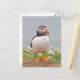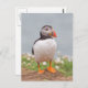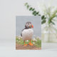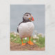 Une vue frontale d'un mignon pouffin debout sur le bord de la falaise avec des fleurs derrière. De Skomer Island.