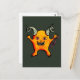 Carte postale démon mignon avec un dessin à l'encre d'un démon bizarre jaune avec des cornes souriant joyeusement et montrant ses dents acérées.