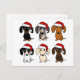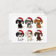 Une variété de Dachshunds à chapeaux de Santa. Envoyez des voeux pour cette période de vacances tout en gardant votre entreprise à l'esprit. Cette carte postale pour chiens éveillés est parfaite pour les vétérinaires, les promeneurs de chiens, les toiletteurs, les garderies pour chiens et plus encore! Black & tan, dapple, rouge, piebald, crème et chocolat Dachshund chiens de dessin animé.