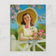 Carte PinUp classique montrant une belle fille Pin-Up au printemps entourée de fleurs et de roses roses, peinte par Art Frahm (1907-1981)