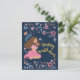 Carte d'anniversaire bleue avec une dame entourée de fleurs.