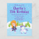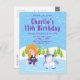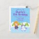 Une jolie fille aux cheveux roux dans un manteau gris foncé, des gants violets, une écharpe et des patins à glace patinant sur une patinoire à côté d'une licorne adorable avec une crinière et une queue violettes et vertes. En arrière-plan, des arbres enneigés, des collines enneigées et un ciel bleu vif avec de la neige qui tombe.