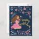 Carte d'anniversaire joyeux bleu avec une dame entourée de fleurs.