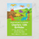 Dinosaures adorables avec un brachiosaure bleu, un tyranosaure orange, un stégosaure jaune, un tricératops violet et des ptérodactyles jaune et orange. En arrière-plan se trouvent un volcan, la lumière du soleil, le ciel et les nuages, un palmier, des empreintes de dinosaures et des œufs.