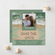 Thème de plage moderne avec vert sauge et teal, photo, date à sauvegarder en lettres de sable et photo personnalisée. REMARQUE : texte, police, couleurs et éléments sont entièrement personnalisables avec l'outil de conception.