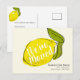 Cette carte postale d'annonce de changement d'adresse ou de déménagement présente un fond jaune citron clair avec un gros citron et des feuilles vertes. Le verso présente un fond blanc avec des citrons. Personnalisez-la selon vos besoins. Vous pouvez trouver des produits assortis dans ma boutique.
