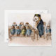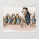 Illustration vintage d'une table de jeunes chouettes avec un hibou "enseignant" en tête de table. Sur une chaise derrière se trouve un hibou portant un casquette dunce