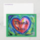 Le message de la carte postale indique : "Merci". La peinture présente un cœur rouge coloré avec des reflets blancs et des accents dorés. Le cœur est contourné de bleu et a un fond vert doux. Cette peinture de cœur est un hommage au maintien de l'espoir dans votre cœur lorsque les bleus tristes vous entourent, mais pousse à aller de l'avant pour un renouveau vert.