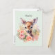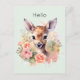 Carte postale avec une belle illustration représentant un cerf mignon. Entouré de roses roses et de fleurs roses.