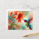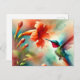 Carte avec peinture à l'aquarelle abstraite d'un colibri à gorge rubis s'approchant d'une fleur de vigne trompette vibrante. Les coups de pinceau dynamiques et les couleurs riches capturent la beauté et l'énergie de la scène.