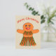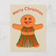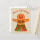 Cette carte postale présente un joli dessin d'une femme en pain d'épice coloré. Elle a les yeux noirs avec des élèves blancs et de jolis cils noirs et un grand sourire sur son visage. Elle a également des tasselles rouges et vertes sur sa jupe et le dessus prêt pour une fête de Noël.