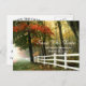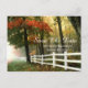 Cette conception présente une jolie photo des saisons qui changent. Les feuilles commencent à virer à l'orange et au jaune, et la brume matinale commence à se dissiper. Personnalisez cette carte postale avec les informations de votre mariage. Cette carte postale convient bien aux mariages d'automne.