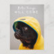 Simple et élégant "Les meilleures choses sont volonté" cite carte postale avec typographie moderne et arrière - plan gris. Représente une photo d'un mignon chien de carlin noir dans un manteau de pluie jaune Paw argenté.