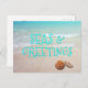 Carte postale de vacances avec scène de plage et coquillages. Tout le texte, au recto et au verso, est facile à modifier à votre goût. Un texte ombré de bleu aqua clair est imprimé sur l'eau de l'océan tropical. Envoyez vos vœux à moindre coût depuis un climat chaud.