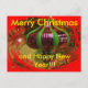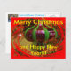 Une ampoule rouge et verte de Noël tournée dans un sapin de Noël,. Avec un cadre rouge clair et coloré qui est sur une CARTE POST DE NOËL! ! ! !