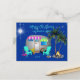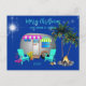 Camping thématique, voeux de Noël par carte postale. Un petit camper en argent est le design sur des cartes postales faciles à customiser. Les palmiers sont ornés de lumières et deux chaises bleu turquoise sont installées au coin du feu de camp, tandis que les étoiles brillent dans le ciel. Flamants roses et coquillages complètent le design tropical. Inscrivez une adresse postale au verso si vous le désirez. Chaque carte postale devra être customisée séparément pour les adresses. Une fois la carte ajoutée à votre panier, cliquez dessus pour revenir à la page produit et customiser la suivante.