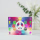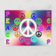 coloré rétro look carte de la paix avec de nombreux petits signes de paix colorés autour d'un blanc plus grand entre crochets par le mot paix écrit verticalement vers le bas et vers le haut