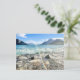 Belle carte postale de sympathie de photographie de paysage avec des montagnes, une vue sur le lac et un arc-en-ciel en surimpression et une citation chrétienne sincère de sympathie au dos comme suit : "Dieu se souvient de nous dans notre douleur et son amour fidèle dure éternellement !"
