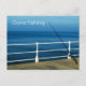 Photographie d'un pôle de pêche reposant sur une rampe sur un quai de pêche. Texte personnalisable