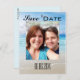 Carte postale de sauvegarde de date avec votre propre photo encadrée par une peinture d'une plage. Idéal pour un mariage sur la plage, un mariage de destination ou de croisière ou un mariage avec un thème nautique.