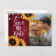 Carte postale de sauvegarde de photo de mariage rustique de tournesol et de Bourgogne avec des tournesols et des guirlandes lumineuses sur un fond en bois rustique. Idéal pour une carte postale pour un mariage rustique de campagne ou de grange en Bourgogne inspiré par les tournesols.
