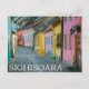 Cette carte postale présente les édifices peints de Sighisoara, en Roumanie. La plupart des gens s'attendent à ce que Sighisoara soit sombre et déplaisant puisqu'il est situé en Transylvanie. Cependant, les gens chaleureux et les bâtiments colorés font vite que les gens se sentent à l'aise.