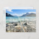 Belle carte postale de sympathie de photographie de paysage avec des montagnes, une vue sur le lac et une superposition d'arc-en-ciel et une citation chrétienne sincère de sympathie au dos comme suit : "Dieu se souvient de nous dans notre douleur et son amour fidèle dure éternellement !"