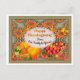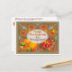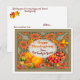 Une magnifique carte de Thanksgiving avec un fond abstrait créé à partir d'une image de baies orange vif, avec un feuillage automnal supplémentaire, des citrouilles colorées et un grand panier de pommes rouges, d'autres légumes et fruits.