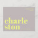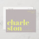 Envoyez une salutation élégante et contemporaine de Charleston en Caroline du Sud avec cette carte postale typographique moderne. Avec le mot Charleston réparti sur deux lignes en minuscules grasses et décoratives en jaune vif sur un fond gris doux, ce design est à la fois minimaliste et accrocheur. La phrase "greetings from" apparaît ci-dessus dans une police sans empattement fine et élégante, ajoutant une touche moderne et élégante. Parfait comme souvenir de voyage, pièce décorative ou moyen unique d'envoyer de l'amour depuis votre ville préférée. Idéal pour les amateurs de design contemporain, de typographie et de wanderlust.
