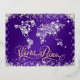 La carte du monde en diamants et typographie de FEUILLE d'aluminium 'Paix Mondiale' Message de vacances - fond en Violet Royal et flocons de neige élégants et étincelants qui entourent ce fond surligné de violet avec un texte de script fantaisiste - Personnalisé avec votre message au dos et NOTE de signature : AUCUN diamant/pierre précieuse réelle n'est sur cette carte - ils sont créés artistiquement pour paraître réels