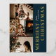 Joyeux Noël Moderne Bleu Or Script Photo Moderne Véritable Foil Carte postale Vacances. Envoyez des voeux de vacances à vos proches avec cette carte de vacances moderne et festive. Tous les textes sont pré-arrangés pour que vous personnalisiez facilement et rapidement avec vos propres détails. Joyeuses fêtes !