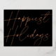 Cette carte postale de vacances d'affaires présente un arrière - plan noir chic et un script de calligraphie moderne "Happiest Holidays" saluant en papier VRAI sur le devant. Au verso, vous trouverez un autre script de salutation (qui peut être supprimé) ainsi que votre propre salutation et votre propre texte. Merci à vos clients ET faites la promotion de votre entreprise cette saison de vacances en envoyant à vos clients une carte postale de vacances FOIL magnifique!