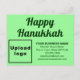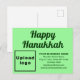Joyeux Hanouka ! Nous vous souhaitons joie, paix et bénédiction pour cette fête des lumières. Vacances pour célébrer ce mois de décembre et pour faire la publicité de votre entreprise également. Carte de vœux de vacances personnalisable que vous pouvez mettre avec votre marque d'entreprise et avec un message de Hanouka. Personnalisez-la et utilisez-la pour saluer vos clients ou vos clients à l'occasion de Hanouka. Vous pouvez également l'utiliser comme matériel marketing pour faire la publicité de votre entreprise ou pour promouvoir votre nom de marque. Carte de vœux de vacances personnalisable que vous pouvez utiliser pour renforcer la notoriété de votre marque. Les couleurs du design sont des textes vert foncé sur fond vert clair. Pour personnaliser cette carte postale, tapez le nom de votre entreprise, votre adresse, votre numéro de téléphone, votre e-mail, votre site web ou votre page de médias sociaux et téléchargez votre logo d'entreprise. Après avoir saisi les textes et téléchargé le logo, veuillez vérifier l'apparence. Si l'apparence vous convient, vous pouvez passer votre commande maintenant. Si vous devez redimensionner et déplacer les textes et le logo pour les adapter à cette carte postale, veuillez modifier dans l'outil de conception. Vous pouvez également modifier la couleur de fond, la couleur de police et le