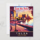 Invitation de mariage pour sauver la date à Tulsa, carte postale de voyage. Beau coucher de soleil dans la ville aux couleurs vives.