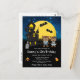 Cette invitation d'anniversaire amusante et effrayante présente des loups-garous mignons à côté d'une maison hantée tordue. En arrière-plan, il y a une pleine lune avec des chauves-souris et un ciel nocturne bleu avec des étoiles. Le texte combine des polices décoratives et serif pour un look élégant et moderne. C'est parfait pour Halloween.
