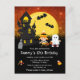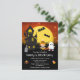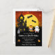 Cette invitation d'anniversaire amusante et effrayante présente une sorcière et un fantôme mignons à côté d'une maison hantée tordue. En arrière-plan, il y a une pleine lune avec des chauves-souris et un ciel nocturne orange avec des étoiles. Le texte combine des polices décoratives et serif pour un look stylé et moderne. C'est parfait pour Halloween.