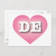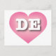 Cette carte postale présente un coeur rose cool et calme avec un centre blanchi contenant les lettres coques supérieures blanches en gras DE, l'abréviation officielle de l'état du Delaware, le premier état. Le verso de la carte postale est vide en attendant vos sentiments manuscrits ou le texte customisé.